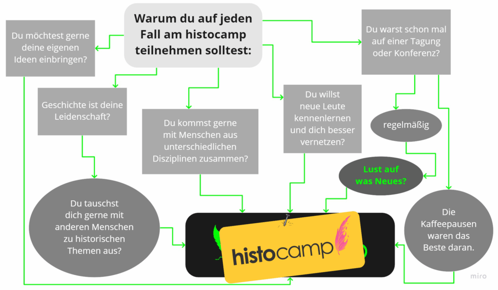 Eingeschränkte Themen, langwierige Bewerbungen, im Vorfeld eingereichte Vortragsmanuskripte: Das sind Kennzeichen (leider) etablierter Formate, die in ihrer Eigenlogik funktionieren, jedoch viele Akteurinnen der Geschichtswissenschaften abschrecken, den (auch fachlichen) Austausch behindern und Flexibilität erschweren. Das histocamp bietet einen radikalen Gegenentwurf an, um diese Probleme zu lösen. Bei uns treffen Geschichtsbegeisterte auf Augenhöhe in einer angenehmen Atmosphäre zusammen. Jeder mit einem Interesse für Geschichte ist explizit eingeladen und dazu aufgerufen, sich aktiv zu beteiligen. Bei uns gibt es keine vorher festgelegten Themen. Diskussionen finden nicht nur in der Kaffeepause statt, sondern vor allem in den Sessions selbst. Wer selbst nicht in einer Session sitzen kann und sich trotzdem für das Thema interessiert, kann über die begleitenden Posts in den sozialen Netzwerken die Diskussionen mitverfolgen.